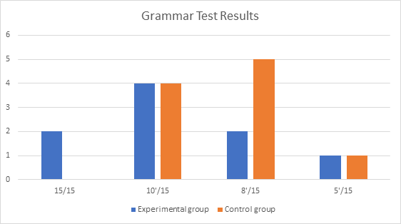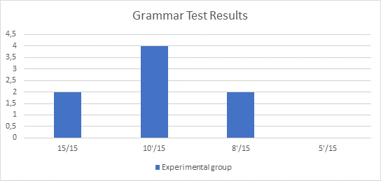 Pre-test consisted of 15 questions, and a total of 15 students participated in the assessment. Figure 1 presents the pre-test results assessing students’ knowledge of the Present, Past, and Future tenses and Conditional sentences. Both groups completed the test, with only one student achieving the highest score. Five students from each group achieved a high score, answering 10 out of 15 questions correctly. Three students from the experimental group and seven from the control group answered 8 out of 15 questions correctly. The remaining two students from each group answered only 5 questions. Thus, it can be concluded that the control and experimental groups demonstrated approximately the same level of proficiency in the grammatical topics during the assessment phase.