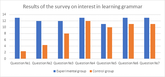 The figure 3 above demonstrates that lessons using multimedia technology have a positive impact on students' cognitive processes and contribute to their motivation to learn a foreign language. Students in the experimental group also reported improved comprehension of the material. Thus, we have proven that using multimedia elements helps students better grasp the features of English grammar. In addition to improved information retention, this system can motivate students to learn English. The increased motivation can be explained by the fact that it is directly related to the student's experience of success. The use of multimedia facilitates this, as we have demonstrated in our experimental work.