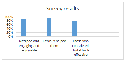 During the second stage of the study, tasks were used that required students to develop collaborative board on the Nearpod. The material presented for the main task was fully studied and worked through in class. In addition to working face-to-face during the tasks, students learned to work in groups and strived to follow the rules that were stated in advance. At the end of the experimental study, students in the experimental group answered questions prepared by the teacher. The survey was conducted to identify the positive impact of multimedia on the educational process in foreign language lessons. The third stage of the study consisted of analyzing and formulating conclusions based on the experimental study. We analyzed the experimental group's responses to draw conclusions about the effectiveness of using multimedia in foreign language lessons. The essence of our study was to confirm that multimedia contributes to better assimilation of the material studied [10;11].