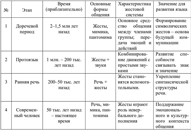 В таблице 2 показано эволюция жестовых систем в человеческом общении – от примитивных форм до современных. Приведённый анализ показывает, что жесты сыграли ключевую роль в формировании человеческой речи и сознания.