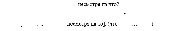 СПП с придаточным уступительным содержит описание ситуации, вопреки которой происходит событие в главной части [4, с. 246]. В СПП с уступительной семантикой компонент что является частью семантического союза несмотря на то что, который «выражает наиболее широкое уступительное значение» [1, с. 231]. Уступительное значение определяется по вопросу несмотря на что? Относится к гибким структурам: придаточная часть может занимать любое место в предложении. «Вместе с тем положение придаточного относительно главной части может вносить дополнительные смысловые оттенки в отношения между частями. Так, позитивное придаточное имеет оттенок присоединения, попутного значения, в интерпозиции придаточное уступки сближается с вводно-вставными конструкциями» [4, с. 247].