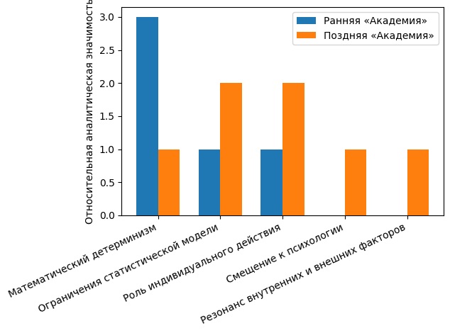 Рисунок 1. Сравнительная динамика ключевых компонентов концепции психоистории в ранних и поздних романах цикла «Академия»