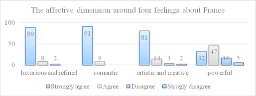 3.3. Affective image. The affective dimension is structured around four feelings: students perceive France as luxurious and refined, romantic, artistic and creative, and powerful. The first three clearly dominate, confirming the romanticised stereotype of France circulating through global cultural products [3, p. 152].