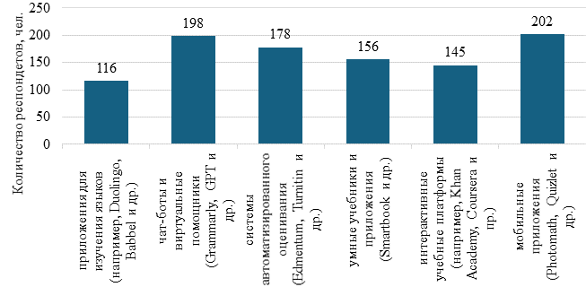 Подводя итоги проведенного анкетирования, можно сделать вывод о том, что все учащиеся используют в учебном процессе технологии ИИ. Среди наиболее частых технологий ИИ используются: приложения для изучения языков (например, Duolingo, Babbel и др.), чат-боты и виртуальные помощники (Grammarly, GPT и др.), системы автоматизированного оценивания (Edmentum, Turnitin и др.), умные учебники и приложения (Smartbook и др.), интерактивные учебные платформы (например, Khan Academy, Coursera и пр.), мобильные приложения (Photomath, Quizlet и др.).