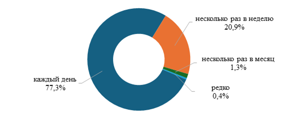 Исходя из того, что большинство учащихся (77,3 %) средней школы используют программы на базе искусственного интеллекта каждый день (рис. 2), можно сделать вывод о большой роли ИИ в процессе обучения. Хотя авторы статьи назвали бы это скорее зависимостью, поскольку некоторые школьники применяют технологии ИИ совершенно необдуманно, не вникая в смысл задач и контрольных упражнений.