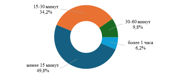 На одну сессию (период взаимодействия пользователя с приложением) половина опрошенных детей (49,8 %) затрачивают менее 15 минут (рис. 3)