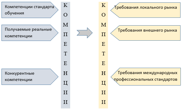 Компетенции выпускника должны быть сосредоточены на профессиональных компетенциях его возможных рабочих мест после окончания вуза (рисунок 1). В учебных планах, утверждаемых Министерством образования и науки Республики Таджикистан для каждой специальности бакалавриата, указывается профессия (квалификация), по которой может работать выпускник.