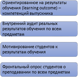 Содержание обучения (рисунок 5) предполагает переход от методов, центрированных на преподавателе, к методам образования, базирующимся на результатах с его акцентом на студенто-центрированное обучение и с требованием большей четкости в структуре и содержании образовательных и учебных программ.