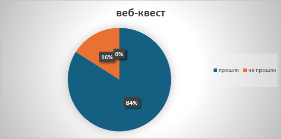 Таким образом, в качестве примера, нами был представлен веб-квест на тему «Из истории календарей», для учащихся 5 классов. По результатам полученных данных (Рис. 1.): 84% учеников выполнили квест, 16% учащихся не смогли пройти квест по семейным обстоятельствам и техническим проблемам. Следует отметить, что учащиеся,взаимодействуя с домашним заданием, получили спектр положительных эмоций, открыли для себя новые знания, критически анализировали и синтезировали знания, развивали логическое мышление, а также улучшили навыки самостоятельного поиска информации и работы с компьютером.