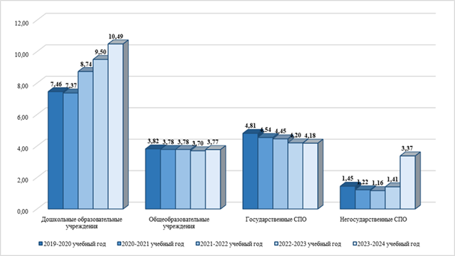 Тенденция к сокращению исследуемого показателя негосударственных учреждений среднего профессионального образования отмечалась до 2022-2023 учебного года. Причиной сложившейся ситуации является непрерывной рост контингента при сокращении площадей образовательных учреждений. Положительную тенденцию показатель демонстрировал в последующий период в связи со значительным ростом занимаемых учреждениями площадей. За рассматриваемый период показатель обеспеченности площадью увеличился в 2,33 раза.