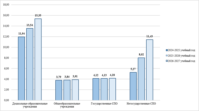 Рисунок 2. Результаты прогнозирования показателя обеспеченности площадью контингента дошкольных, общеобразовательных, средних профессиональных образовательных учреждений Санкт-Петербурга на период 2024-2026 гг., кв.м./чел.