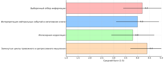 1. Выборочный отбор информации: 76% (19 из 25) клиентов получили оценки 4 или 5, что свидетельствует о высокой выраженности этого когнитивного искажения. Средний балл по шкале: 4.2 ± 0.8.