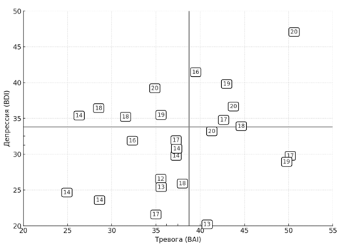 Связь между показателями: у 88% (22 из 25) пациентов наблюдается совпадение высоких значений (4 или 5) по шкалам предвзятости подтверждения и замкнутых циклов тревоги и депрессии.