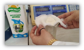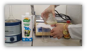 В стакан емкостью 300 мл налить 200 мл 1% молока и нагреть в колбонагревателе до 40°C. В подогретое молоко прилить 10 мл 9% раствора уксусной кислоты (обычно добавляется соляная кислота).