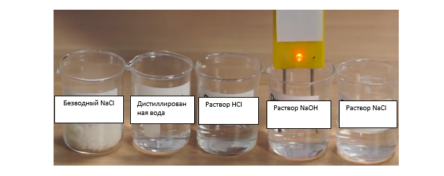 Вводный эксперимент: Учитель готовит 5 стеклянных стаканчиков, содержащих: безводный хлорид натрия, дистиллированную воду, раствор соляной кислоты, раствор гидроксида натрия, раствор хлорида натрия и измеритель проводимости. Учитель по очереди опускает измеритель проводимости в эти стеклянные стаканчики. Учащиеся с интересом наблюдают и легко распознают: какой раствор заставляет лампочку загореться, является проводящим. Растворы: соляная кислота, гидроксид натрия, хлорид натрия заставляют лампочку загореться, поэтому эти растворы являются проводящими. Так почему же эти растворы являются проводящими? Эксперимент не только привлекает внимание учащихся, но и стимулирует их мышление.