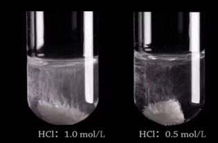 Одновременно добавьте 0,5 мл раствора соляной кислоты концентрацией 1 моль/л в пробирку (1) и 0,5 мл раствора соляной кислоты 0,5 моль/л в пробирку (2). Учащиеся наблюдают за скоростью реакции, происходящей в обеих пробирках, и задают вопросы: Почему газ выходит быстрее в пробирке (1), чем в пробирке (2)? Вопросы стимулируют мышление учащихся, вызывая у них интерес к обучению.