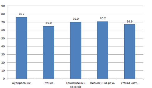 Рисунок 1. Средние проценты выполнения заданий по разделам экзаменационной работы по английскому языку [1. с. 10]