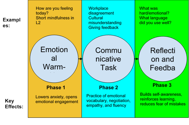 The three stages of a normal 60–90 minute course are: (1) Emotional Warm-up; (2) Communicative Task; and (3) Reflection and Feedback. The lecturer establishes the affective tone for the class during the Emotional Warm-up. A quick round of personal sharing could be part of this (e.g., "How are you feeling today?). In the target language, do a little mindfulness practice or share something that made you joyful or anxious this week. The objective is to establish a trusting environment by assisting students in assessing their feelings and reducing tension at the outset. Language educators' research has demonstrated the importance of these activities; by demonstrating concern for students' feelings and promoting transparency, teachers can create emotionally supportive environments [8].