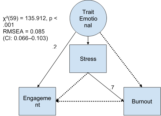 A path model, which is a type of structural equation model, or SEM, is illustrated in Figure 3 to pinpoint how engagement, stress, and burnout are impacted by trait emotional intelligence (TEI). Model fit indices, represented by the equations on the left, are used to assess how well the model matches the real data: