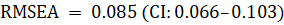 0.085 (90% CI: 0.066–0.103) was the observed root mean square error of approximation (RMSEA), which is slightly above the acceptable threshold and generally regarded as reflecting a mediocre fit. Values below .08 are generally considered indicative of an acceptable fit, and values below .05 suggest a close fit.