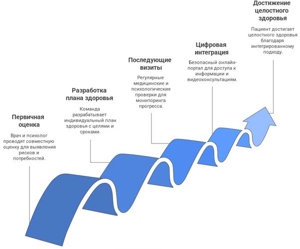 Все сведения попадают в единую электронную карту, доступную обоим специалистам и самой пациентке через защищённый портал. Благодаря этому любая коррекция instantly отражается во всех разделах карты, а женщина может в удобный момент напомнить себе рекомендации. Для регионов с ограниченной доступностью очных визитов предусмотрены видеоконсультации: пациентка подключается из дома, врач просматривает результаты анализов, психолог проводит короткую сессию саморегуляции, и всё это интегрируется в общий протокол. Общий цикл представлен на рисунке 2.