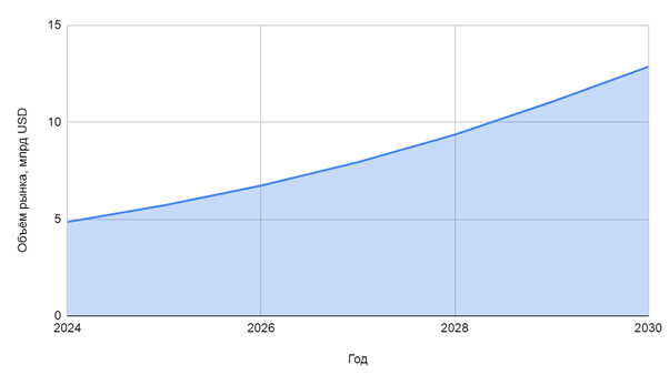 При этом, объем мирового рынка приложений для женского здоровья оценивался в 4,85 млрд долларов США в 2024 году и, по прогнозам, достигнет 12,87 млрд долларов США к 2030 году, увеличиваясь в среднем на 17,78% в год в период с 2025 по 2030 год, что показано на рисунке 3 [17].