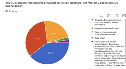 Подводя итоги исследования, можно констатировать, что проблема “формального чтения” в современной школе носит не ситуативный, а системный характер. Результаты проведенного анкетирования подтвердили, что абсолютное большинство педагогов (97,9%) сталкиваются с механическим декодированием текста учащимися, при котором смысл прочитанного остается недоступным.