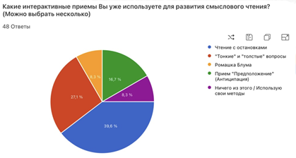 В-третьих, обнаружен дисбаланс в применении методических приемов(см. Диаграмму 3). Анализ используемых педагогами стратегий показал прямую корреляцию между выявленной причиной (“гонка за скоростью”) и популярным методом решения (“чтение с остановками” - 39,6 %). Также активное применение текстового этапа (“Тонкие и толстые” -27,1%) и предтекстового этапа (“Антиципация” -16,7%). Однако стратегии послетекстового этапа, направленные на глубокую рефлексию, синтез и интериоризацию информации (например “Ромашка Блума”), используются крайне редко (8,3%)