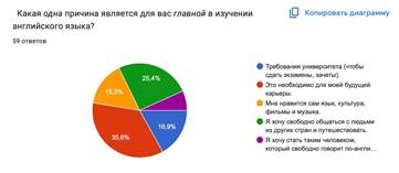 Изучение полученных данных позволило выявить ряд закономерностей. На первом этапе мы проанализировали, что именно побуждает студентов изучать английский язык (см. Диаграмму 1). Результаты показали неоднозначную картину мотивации студентов. Заметно преобладает ориентация на внешние цели: в общей сложности 52,5% студентов мотивированы прагматическими признаками. Из них 35,6% стремятся к улучшению карьерных перспектив, а 16,9% - к формальному выполнению требований учебного заведения. При этом наблюдается недостаток внутренней мотивации, поскольку искренний интерес к общению и культуре только языка является главным стимулом только для 40,7% опрошенных (25,4% -стремление к общению,15,3%- интерес к страноведению) концепция «идеального Я» как цели самореализации была отмечена лишь у 6,8% студентов. Таким образом , можно сделать вывод о том, что большинство студентов- гуманитариев испытывают дисбаланс: несмотря на высокую профессиональную важность языка, его изучение стимулируется в основном внешним давлениям, а не внутренним желанием. Согласно теории З. Дерни, такой подход снижает психологическую устойчивость.