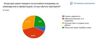 На втором этапе исследования мы оценили психоэмоциональное состояние студентов в ситуациях, требующих спонтанного говорения (см. Диаграмму 2). Результаты свидетельствуют о критически высоком уровне тревожности при общении. Более половины опрошенных (54,1%) испытывают сильный стресс: из них 31,1% отмечают сильное психоэмоциональное напряжение, а 23% описывают свое состояние как «панику» и полную неспособность мыслить. Незначительное волнение испытывают 39,3% респондентов, в то время как уверенно общаются на иностранном языке лишь 6,6% студентов. Это позволяет сделать вывод о наличии ярко выраженного «языкового барьера» у подавляющего большинства студентов.