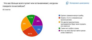 Для определения причин столь высокого уровня тревожности был проведен анализ субъективных страхов студентов (см. Диаграмму 3). Полученные данные позволяют опровергнуть стереотип о том, что главным барьером является незнание грамматики. Иерархия страхов показывает, что лидирующие позиции занимает страх фонетической ошибки (26,7%) и страх социальной оценки (25%). Суммарно более 51% студентов блокирует свою речь из-за боязни «звучать неправильно» или подвергнуться осуждению со стороны окружения. Когнитивные затруднения составляет 20%, а страх грамматической ошибки- всего 15%. Интерпретация данных указывает на структуру страхов: студенты боятся не столько «потерять лицо» в социальном контексте. Высокие требования к себе и зависимость от мнения группы создают мощный психологический блок, препятствующий свободной речи.
