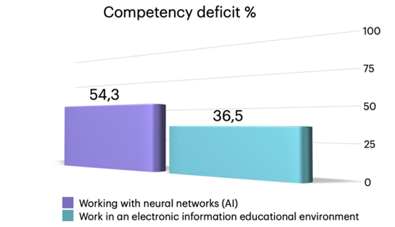 One of the goals of our study was to determine the development of university teachers' competencies. We conducted a joint study with HSE University as part of the Mirror Lab project to assess competency gaps among university faculty. The study revealed that the primary gaps among faculty members are digital competencies and competencies related to working in an electronic information educational environment. In this article, we limit our analysis to digital competencies. Digital competencies (general and professional digital competencies – the ability to solve highly specialized problems in a digital environment) are based on Rizza C.'s typology, as well as the list of in-demand competencies and skills in the digital environment compiled by the Institute for Statistical Studies and Economics of Knowledge at the National Research University Higher School of Economics using a systemic analysis of IFora big data. We define a deficit as the proportion of respondents who say they lack or are insufficiently proficient (for professional activity) in a specific competency. The completion strategy is the actual gaps/need for competencies and their completion (where and how: paid/free).