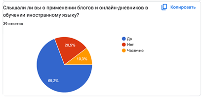 Результаты исследования. Для получения общей информации о степени осведомленности студентов о применении блогов в обучении нами был задан соответствующий вопрос в анкете. Как показал анализ ответов только 8 студентов среди опрошенных не имеют понятия об этом методе. Несмотря на это, большинство респондентов, а именно 27 человек, что составило 69,2% от всех опрошенных, отметили, что знакомы с применением онлайн-дневников в обучении иностранному языку. Частично имеют представление 10,3% опрошенных (Диаграмма 1).