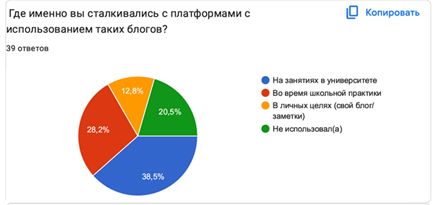 Если большинство респондентов все-таки знакомы и имеют понимание об онлайн-блогах, тогда перед нами встал вопрос где они сталкивались с ними. Поэтому этот пункт был включен в перечень вопрос анкеты. Как показал анализ результатов 38,5% опрошенных сталкивались с инструментами этого метода на занятиях в университете, 28,2% - во время прохождения педагогической практики в школе, 12,8% используют онлайн-блоги в личных целях. Из всех только 8 человек, что составило 20,5% всех опрошенных соответственно, не использовал этот метод никогда (Диаграмма 2).