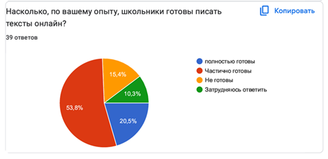 Отвечая на третий вопрос о готовности школьников писать тексты онлайн, 21 респондентов, что составляет 53,8% отметили, что учащиеся «частично готовы» к такому формату работы. Анализируя результаты, можно наблюдать, что полную готовность констатировал лишь 8 участников (20,5%), тогда как 6 человек (15,4%) указали на неготовность школьников, а 4 респондента (10,3%) затруднились с ответом. (Диаграмма 3).