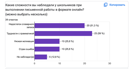 Четвертый вопрос в анкете предполагал возможность выбора нескольких вариантов ответа. Наиболее распространенной проблемой 23 студента назвали трудности с грамматикой, что составляет 59% от общего числа опрошенных, на втором месте оказался недостаток словарного запаса – 20 респондентов (51,3%). Низкую мотивацию и страх ошибок отметили по 10 соответственно, что составило 25,6%. Только 5 участника опроса (12,8%) указали, что не наблюдали сложностей у школьников. (Рис. 4).