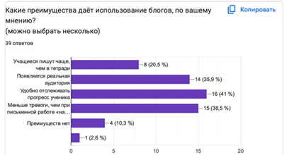 Как показал анализ результатов пятого вопроса, ключевыми преимуществами использования блогов респондентов назвали: удобство отслеживания прогресса ученика – 16 человек (41%), снижение тревожности по сравнению с работой «на оценку» –15 респондентов (38,5%), появление реальной аудитории – 14 человек (35,9%). Меньшее количество участников – 8 человек (20,5%) – отметили, что учащиеся пишут чаще, чем в тетради. При этом 4 респондента (10,3%) не видят преимуществ в использовании блогов (Рис. 5).