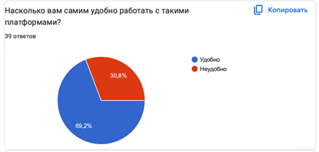 Шестой вопрос был направлен на оценку личного опыта респондентов, чтобы понять насколько комфортно сами студенты чувствуют себя при работе с цифровыми платформами. Как можно увидеть ниже, большинство – 27 человек, что составляет 69,2% от общего числа опрошенных, – находят работу с блоговыми платформами удобной. В то же время 12 респондентов (30,8%) отметили неудобство при взаимодействии с такими инструментами (Диаграмма 6).