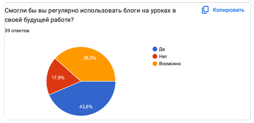 Согласно ответам на седьмой вопрос, 17 человек (43,6%) выразили готовность регулярно использовать блоги на уроках в своей будущей работе. Еще 15 респондентов (38,5%) выбрали вариант «возможно», что свидетельствует о потенциальной заинтересованности. Категорически отказались от такого формата работы 7 участников опроса, что составило 17,9% от общего числа опрошенных. (Диаграмма 7).