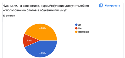 Результаты восьмого вопроса показали, что мнения студентов разделились ровно поровну: 17 человек (43,6%) считают необходимыми курсы или обучение для учителей по использованию блогов в обучении письма, столько же респондентов (43,6%) выбрали вариант «возможно». Лишь 5 участников опроса (12,8%) не видят потребности в таком обучении (Диаграмма 8).