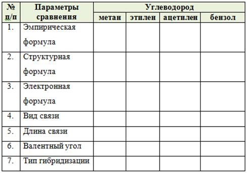 После изучения элементов главных подгрупп и их соединений студентам предлагается провести сравнение, т. е. показать, что в пределах одной и той же подгруппы находятся элементы, имеющие много общего в строении и свойствах, но в то же время обладающие индивидуальными особенностями. В качестве примера возьмем подгруппу углерода. Сначала следует установить признаки, по которым проводится сравнение: строение атома, простые вещества, соединение с водородом, соединение с кислородом. Затем для этих соединений сравнение проводится по плану: состав, строение, физические и химические свойства, получение, нахождение в природе, применение. Здесь же уместно выделить отдельно простые вещества или соединения одного и того же элемента, различающиеся либо структурой (как алмаз и графит), либо разной степенью окисления (как оксиды углерода (II) и (IV)). Очень удобен приём сравнения при изучении сходных вопросов. Студенты имеют определенную базу знаний, у них имеется конспект лекций, и они вполне могут проводить сравнение самостоятельно. Например, приём сравнения был применён после изучения темы органической химии «Углеводороды» путём заполнения студентами в индивидуальном порядке разработанной автором концептуальной таблицы (табл. 1)