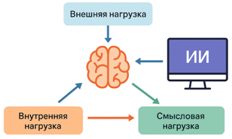 ИИ, выступая как тьютор, способен снижать CLextraneous (устраняя избыточные формулировки и рутинные вычисления) и усиливать CLgermane – то есть стимулировать формирование устойчивых когнитивных схем. Однако при отсутствии регуляции может наблюдаться обратный эффект: рост внешней нагрузки за счёт переключений между интерфейсом и задачей, а также ослабление внутренней активности обучающегося (рис. 2).