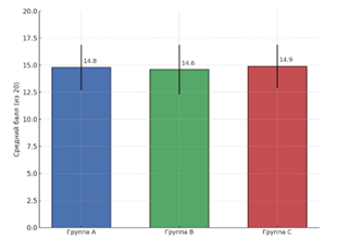 До начала основного этапа эксперимента проведён входной тест, включавший 20 заданий базового и среднего уровня сложности: логарифмические преобразования, линейные и квадратные уравнения с параметрами, задачи на арифметические и геометрические прогрессии, а также элементы планиметрии. Итоговый балл определялся по числу верных решений. Средние результаты оказались равномерными: группа A – 14,8 балла (SD = 2,1), группа B – 14,6 (SD = 2,3), группа C – 14,9 (SD = 2,0). Однофакторный дисперсионный анализ подтвердил отсутствие статистически значимых различий между группами (F (2,144) = 0,312; p = 0,732), что позволяет считать выборку однородной и пригодной для сопоставления дальнейших результатов (табл. 3).