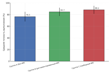- группа C – с полным свободным доступом к ИИ-инструментам (n = 48).