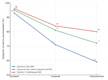 Данные подтверждают, что степень участия искусственного интеллекта прямо связана с изменением когнитивной структуры деятельности учащихся: при регламентированном доступе наблюдается баланс между эффективностью и аналитической глубиной, тогда как при свободном – увеличение продуктивности при снижении аргументированности.
