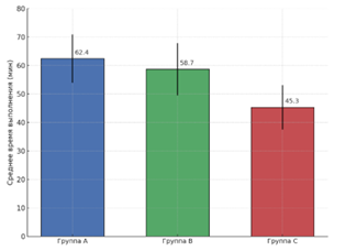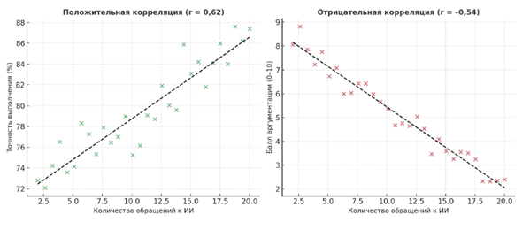 Корреляционный анализ подтвердил статистически значимые связи между интенсивностью использования ИИ и параметрами эффективности: в группе C наблюдалась положительная зависимость между количеством обращений и точностью (r = 0,62; p <0,01) и отрицательная – с качеством аргументации (r = –0,54; p <0,01) (рис. 8).