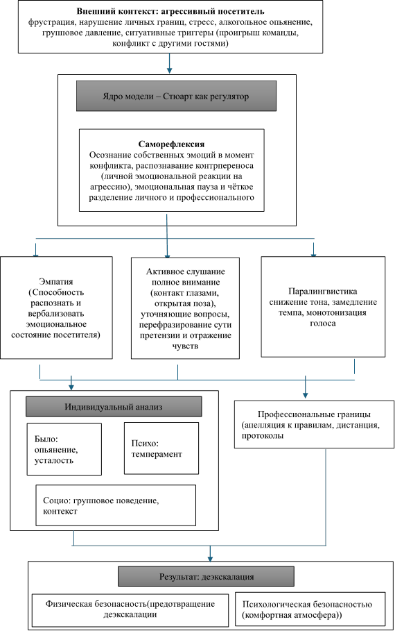 Таким образом, теоретической основой работы стюарта с агрессией становится понимание её не как злонамеренного действия, а как симптома внутреннего неблагополучия или внешней провокации. Этот перенос клинического мышления в практику обслуживания позволяет персоналу действовать не реактивно (просто реагируя на нарушение), а проактивно – управляя ситуацией, предотвращая её эскалацию и сохраняя безопасную атмосферу для всех присутствующих.