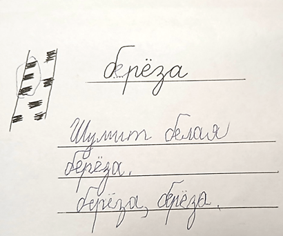 Почему используется перо на занятиях? Этот инструмент позволяет прочувствовать ребёнку всю суть «правильного написания». Большинство современных ручек не соответствует заявленным гигиеническим требованиям к письменным принадлежностям. Неправильный захват ручки не привлекает внимание ученика, он просто выполняет задание, так как она при любом нажатии оставляет след на бумаге. Другой вопрос о качестве такого письма? Применение пера – это особая техника. Правильно нужно держать инструмент, использовать силу нажима в зависимости от направления письма. Конечно, длительность написания становится в разы дольше, однако этот процесс поглощает школьника. Он успевает обдумать, что и как записать дальше, пока опускает перья в чернила. В это время его концентрация внимания повышается, а значит повышается результат. Однако, этот метод является вспомогательным, а не основным, так как главными инструментами обучающихся всё-таки является ручка и карандаш. Для повышения качества орфографической зоркости используется игра «Аналогии», где с помощью рисунков можно запомнить написание трудных или словарных слов. Например, перед школьником лежит карточка со словом б…рёза и рядом небольшой фрагмент этого дерева. Задача ребенка увидеть подсказку и запомнить написание слова. Сделать это легко. Чёрные вкрапления на стволе очень похожи на букву «Е», которую ученик замечает, запоминает и самостоятельно прописывает потом слово и придумывает с ним целое предложение (см. рисунок 1).
