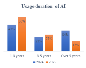 At first, we have to determine the usage duration of AI. How long had students been using AI? It revealed that 43%–56% of the students had used AI for between 1 and 3 years. It indicates that because they were being used for educational purposes, students started to utilize smart devices and AI tools more frequently in high school and as they entered universities. 23%–27% of the students had used them for between 3 and 5 years, which means that they had used them actively from their teenage years. 34%–17% of the students had used artificial intelligence (AI) for over 5 years, so some of the students had more interest in AI tools; also, they had more opportunities to use smart devices and the Internet. The input indicates that the use of artificial intelligence (AI) among students is prevalent. Furthermore, new technologies and innovative approaches to AI tools are integral to both learning and daily life.