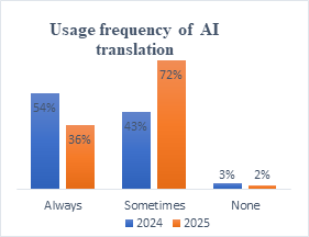 Figure 2 presented how actively students used AI translation tools. It revealed that 54% of the students used it always, and 43% of the students used it sometimes in 2024; 36% of the students used it always, and 72% of the students used it sometimes in 2025. Only 2% to 3% of the students have not used it for translation, indicating that they prefer to translate it on their own. Approximately 97-98% of the students actively used AI translation during class practices, with translation being necessary in every instance. This indicates that AI tools were an integral part of both learning and everyday life.